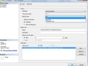 Full Backup – backs up the entire database data file. Does not backup or truncate the transaction log.